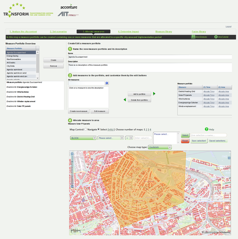 Allocate and apply measures to selected districts, streets, blocks or buildings directly on the map, using a variety of selection criteria (e.g. energy label of buildings)