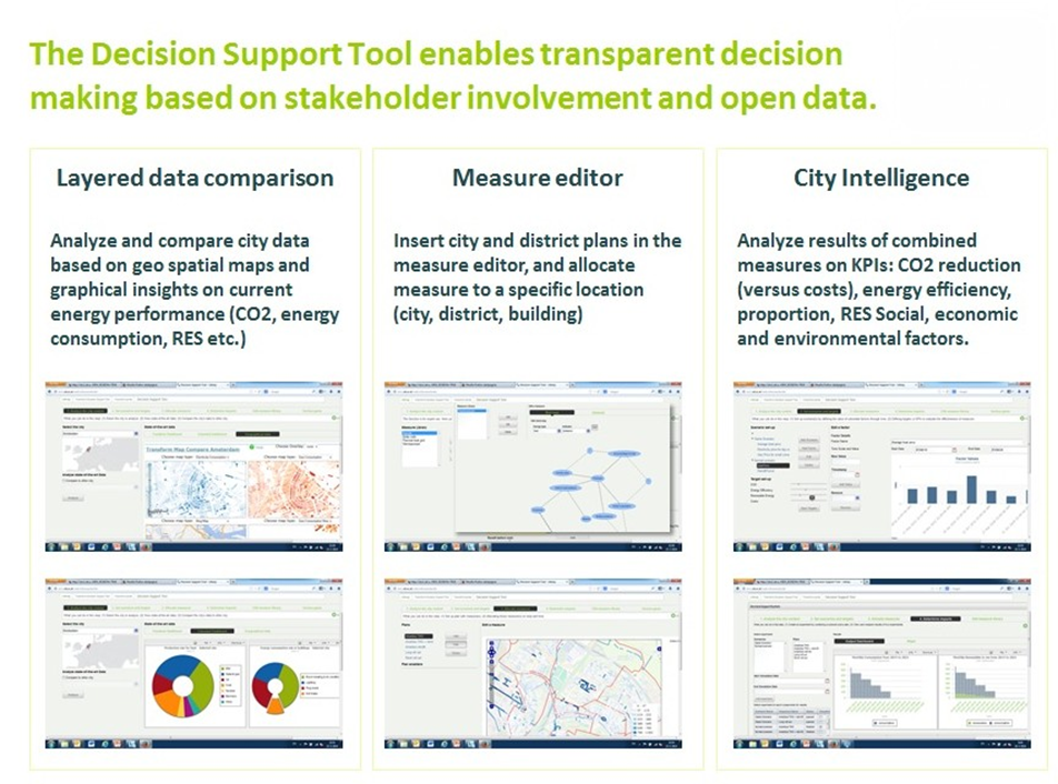It addresses several features: an “easy to use” interactive scenario development and result mapping, allowing selection, virtual allocation of measures and finally assessing the local and city-wide effects of the measures regarding impacts on urban environment – due to energy use and greenhouse gas emissions, and on the economy – through implementation costs and effects on the cities’ employment and income.